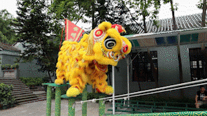 一会儿俏皮地眨眼,一会儿又摇摆起狮头,还机灵地叼起花束、解开祝福的对联。