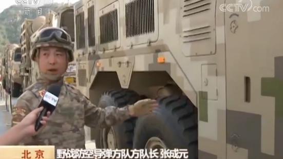 野战防空导弹方队方队长 张成元:整个车整体的设计和构造,采取了轻型装甲和轮式底盘的结构,采取悬挂式的装置,可以整车的,上下调节底盘的高度。这样大大增加了它底盘的高度,增加了我们这款装备的越野机动性能,更适合于我们广大的陆战场。