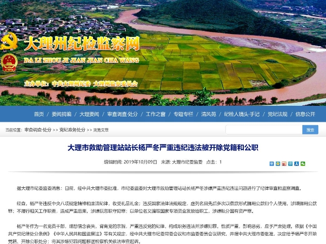 杨严冬作为一名党员干部,理想信念丧失,背离党的宗旨,严重违反党的纪律,构成职务违法并涉嫌犯罪,性质严重,影响恶劣,应予严肃处理。依据《中国共产党纪律处分条例》《中华人民共和国监察法》等有关规定,经中共大理市纪委常委会议和市监委委员会议研究,并报中共大理市委批准,决定给予杨严冬开除党籍、开除公职处分;将其涉嫌犯罪问题移送检察机关依法审查起诉。