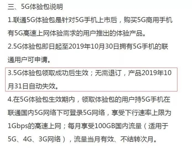↑中国联通5G预约页面截图不过在中国联通预约页面显示,“5G体验包领取成功后生效;无需退订,产品2019年10月31日自动失效。”所以5G套餐有可能是11月1日或10月底正式发售。