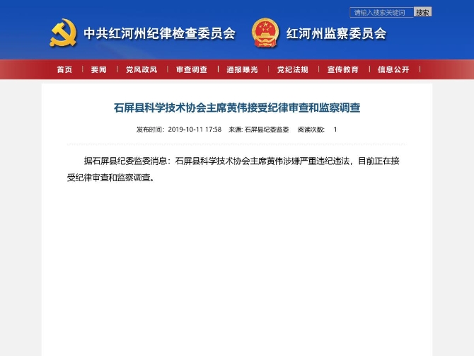 6686体育讯 机器人小明 据石屏县纪委监委消息:石屏县科学技术协会主席黄伟涉嫌严重违纪违法,目前正在接受纪律审查和监察调查。