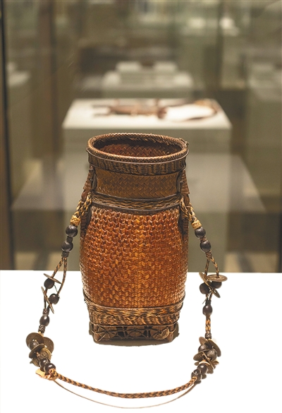 镂空方底圆形挂铜钱竹藤腰篓。宋国强/摄