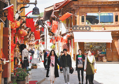 “十一”期间,不少游客在独克宗古城内感受香格里拉多元文化。洛桑央宗/摄