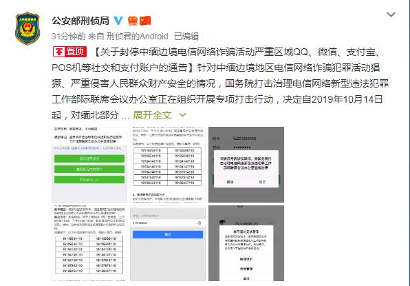 6686体育讯 10月15日下午,公安部刑事侦查局官方微博“公安部刑侦局”发布微博,对缅北部分电信网络诈骗活动严重区域的QQ、微信、支付宝、POS机等社交和支付账户封停一事进行了通告。通告全文如下: