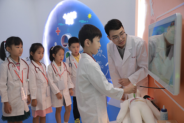 如果乘坐地铁前往复旦大学附属儿科医院,要从上海地铁12号线顾戴路下车。在站内,一块占地50多平方米的空间被开发为“梦想医学院——儿童医学体验馆”,这里堪比儿童乐园:小朋友们身穿白大褂,不但可以学习健康知识,还可以扮演一位“小医生”,通过高仿真医学器材,实际体验模拟的B超、X光、手术操作等,真实接触医学。