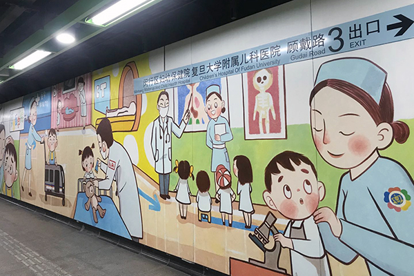 在站内通往儿科医院方向的长廊两侧,绘有一个小男孩从害怕看病到配合医生、最后立志成为医生的漫画故事。“很多孩子通过医疗游戏模拟就医的过程,获得医学科普知识,也更加了解自己的身体,不但不再恐惧看病,还对医学产生了浓厚的兴趣。”复旦大学附属儿科医院社工部主任傅丽丽说。