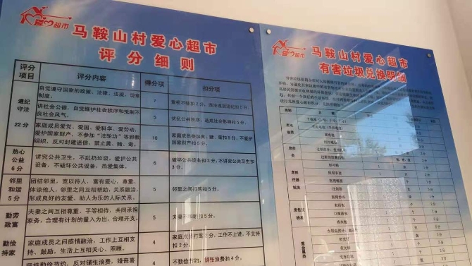 马鞍山村2019年3月成立“爱心超市”,整合社会爱心人士、企业和民政部门捐助的各类生活用品,供村民使用积分兑换。积分不用钱换,而是在对村民遵规守纪、热心公益、邻里和谐、勤劳致富、勤俭持家、环境卫生、孝老爱亲等多个方面进行入户考核后按规则发放。