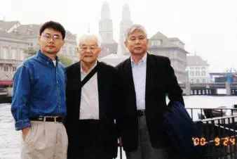 2000年吴文俊与高小山(左一)、石赫(右一)在瑞士苏黎世访问