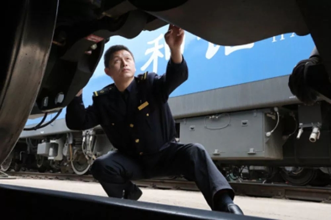 ▲景生启在检查2万吨重载列车牵引机车走行部。(刘国昌)