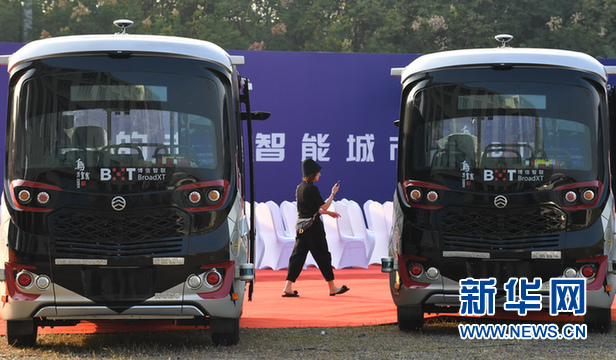 这是10月19日在乌镇城市开放道路“5G自动微公交”示范线路开通剪彩仪式上拍摄的“5G自动微公交”。新华社记者 尹栋逊/摄