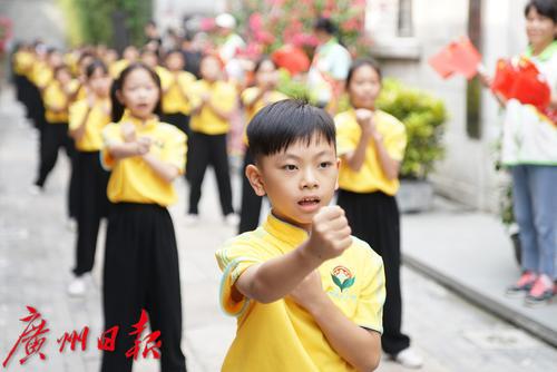 移步位于永庆坊的銮舆堂,一场“粤韵脸谱”快闪正在进行。銮舆堂大门慢慢打开,由粤剧艺术博物馆少儿传承基地小演员扮演的“生、旦、净、末、丑”等粤剧人物,从里面踏着戏曲碎步在门前进行粤剧行当展示。几步之隔的李小龙祖居门口,“武动西关”快闪随之展开。伴随着气势磅礴的音乐,来自荔湾区五眼桥小学的学子从不同的地方声势浩荡地迅速聚集,表演起岭南传统武术。