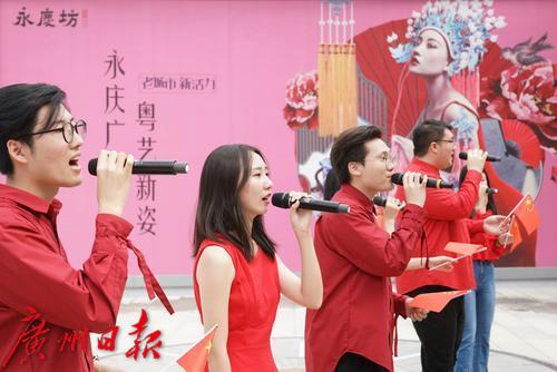 而永庆坊附近的恩宁路177号,被誉为“全球粤剧艺人祖屋”的八和会馆外,2名穿戏服的小演员慢慢推开八和会馆大门,踏着鼓点节奏开始表演经典粤剧《琼莲公主》选段,把过往的市民群众带入粤剧的沉浸式体验。粤音刚落,附近的金声电影院歌声再起。一场“齐唱红歌”快闪在永庆坊二期金声广场“永庆环”举行,6名青年用青春的、美妙的歌声演绎着《飞得更高》《我的祖国》《歌唱祖国》等经典曲目,抒发时代朝气和爱国之情。