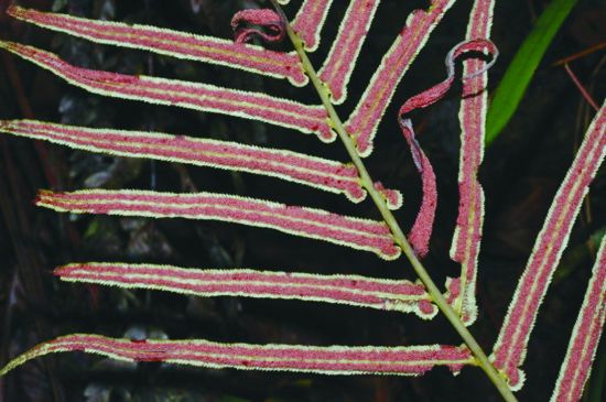 苏铁蕨为乌毛蕨科苏铁蕨属的模式及单一种,以外形似苏铁科植物而得名,顶部与叶柄基部均密被鳞片;鳞片线形,长达3厘米,先端钻状渐尖,边缘略具缘毛,红棕色或褐棕色,有光泽,膜质。叶簇生于主轴的顶部,略呈二形;叶柄长10-30厘米,粗3-6毫米,棕禾秆色,坚硬,光滑或下部略显粗糙;叶片椭圆披针形,长50-100厘米,一回羽状;羽片30-50对,对生或互生,线状披针形至狭披针形,先端长渐尖,近无柄,边缘有细密的锯齿,偶有少数不整齐的裂片;能育叶与不育叶同形,仅羽片较短较狭,彼此较疏离,缘有时呈不规则的浅裂。叶脉两面均明显,沿主脉两侧各有1行三角形或多角形网眼,网眼外的小脉分离,单一或一至二回分叉。叶革质,叶轴棕禾秆色,上面有纵沟,光滑。孢子囊群沿主脉两侧的小脉着生,成熟时逐渐满布于主脉两侧,最终满布于能育羽片的下面。