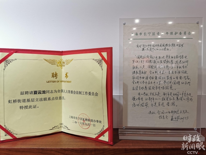 △古北社区居民夏云龙的信息员聘书和他对《国歌法》立法的建议。