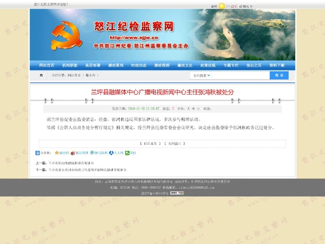 依据《公职人员政务处分暂行规定》相关规定,经兰坪县纪委常委会会议研究,决定由县监委给予张鸿秋政务记过处分。(本文由6686体育写稿机器人小明根据怒江纪检监察委网站数据自动合成发布)