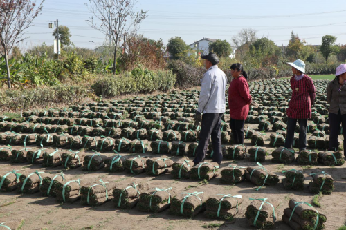 “村里大多数人家的田都流转了,每户不仅每亩地可收取租金,还可在草坪合作社干活。你们看正在田间劳作的这些都是50、60后的村民,他们一天最多的能挣到300元左右,慢一点的大概一天挣到100-200元。”村里相关负责人刘先生向记者介绍说。