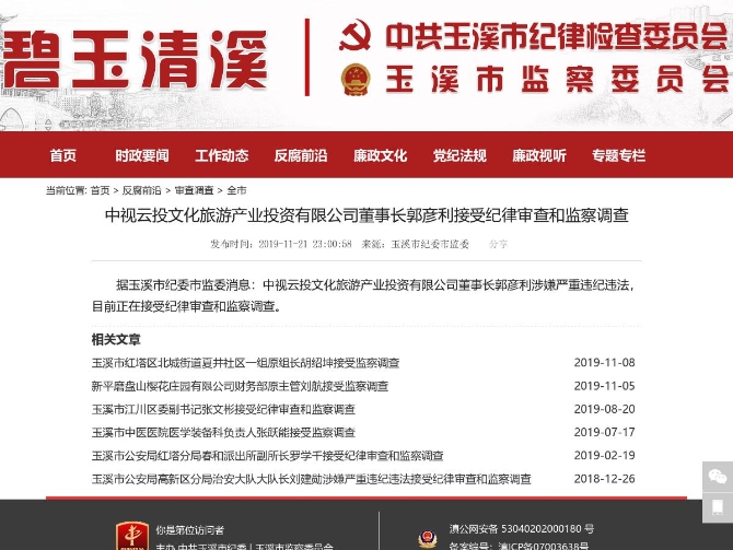 6686体育讯 机器人小明 据玉溪市纪委市监委消息:中视云投文化旅游产业投资有限公司董事长郭彦利涉嫌严重违纪违法,目前正在接受纪律审查和监察调查。