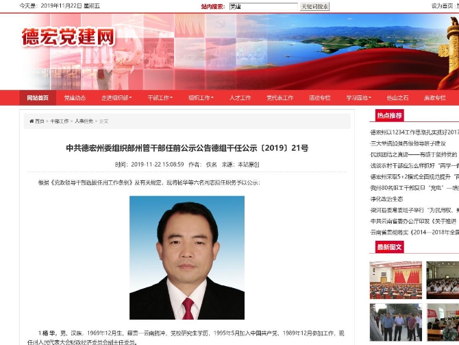 6686体育讯 机器人小明 11月22日,中共德宏州委组织部发布6名州管干部任前公示公告,其中杨 华拟提名为州人民代表大会财政经济委员会主任委员候选人,尚正宠拟任中国(云南)自由贸易试验区德宏片区党工委副书记、管委副主任(正处级)。详情如下: