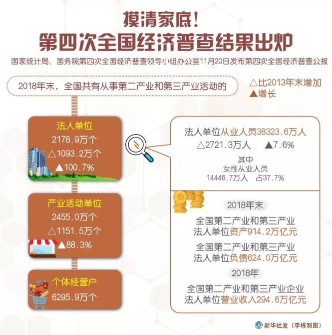 2018年末,全国共有从事第二产业和第三产业活动的法人单位2178.9万个,与2013年第三次全国经济普查相比,增长100.7%。产业活动单位2455.0万个,增长88.3%。个体经营户6295.9万个,而2013年末有证照个体经营户为3279.1万个。
