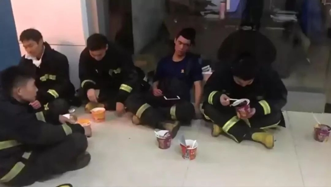 11月25日凌晨,江西南昌进贤县,消防指战员经过长时间鏖战,成功扑救完一建筑物火灾。因天气突然变冷,风很大,全体指战员坚守现场防止复燃,疲惫不堪的战斗员轮流吃方便面充饥。