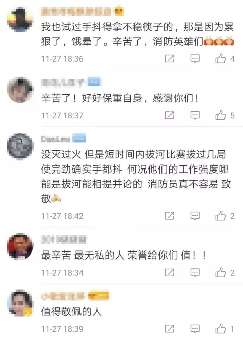 看到这则视频,很多网友表示很心疼,谢谢这些可爱可敬的消防官兵!有网友也表示,自己也曾手抖地拿不稳筷子,那是因为累瘫了……