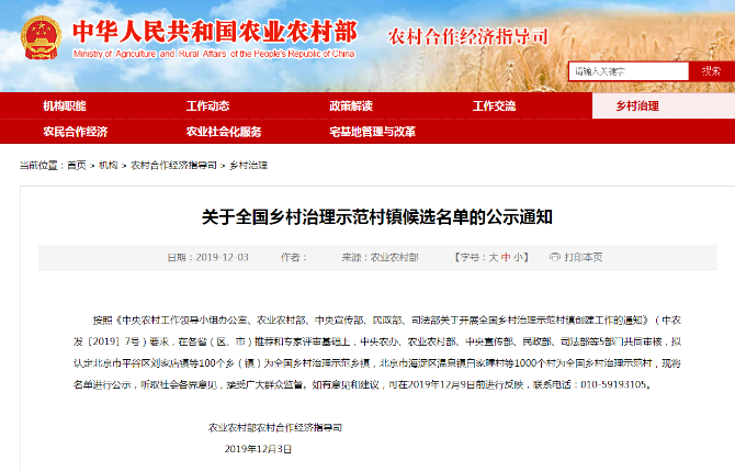按照《中央农村工作领导小组办公室、农业农村部、中央宣传部、民政部、司法部关于开展全国乡村治理示范村镇创建工作的通知》(中农发〔2019〕7号)要求,在各省(区、市)推荐和专家评审基础上,中央农办、农业农村部、中央宣传部、民政部、司法部等5部门共同审核,拟认定100个乡(镇)为全国乡村治理示范乡镇,1000个村为全国乡村治理示范村,现将名单进行公示,听取社会各界意见,接受广大群众监督。如有意见和建议,可在2019年12月9日前进行反映,联系电话:010-59193105。