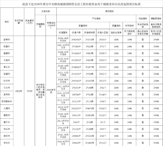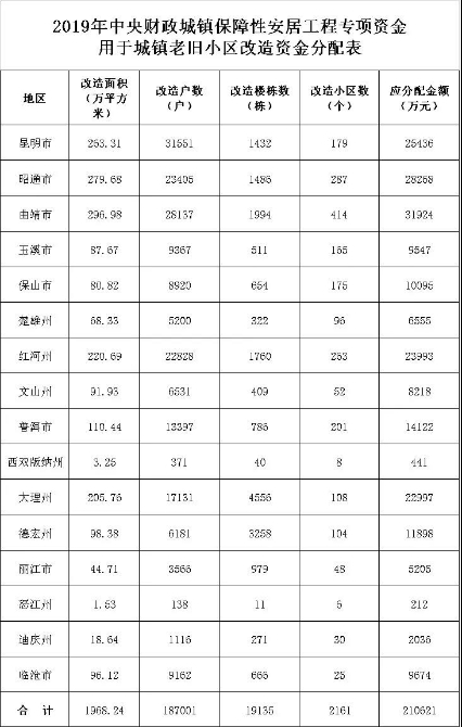 其中,曲靖市的改造面积最多,共296.98万平方米,改造户数28137户,改造楼栋1994栋,改造小区414个,应分配金额31924万元。