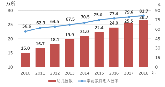 1.学前教育发展水平稳步提升。2018年,中共中央、国务院印发了《关于学前教育深化改革规范发展的若干意见》,进一步推动了我国学前教育的改革与发展。2018年,全国财政性教育经费中学前教育经费占比达4.8%,比上年提高0.2个百分点。全国共有幼儿园26.7万所(见图2),其中公办幼儿园10.1万所,民办幼儿园16.6万所,分别比上年增长4.6%、6.7%和3.4%;分布在城市和农村的公办幼儿园分别为1.9万所和8.2万所,分别比上年增长5.4%和7%。全国共有幼儿园专任教师258.1万人,学前教育(包括幼儿园和附设幼儿班)在园幼儿4656.4万人,分别比上年增长6.1%和1.2%。全国学前教育毛入园率为81.7%,比上年提高2.1个百分点,自2014年实现“达到70%”的《纲要》目标后,持续保持上升态势。