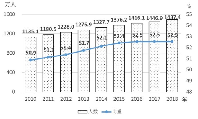 4.女性接受高等教育水平提高。近年来,中国高等教育快速发展,整体已进入世界中上水平。高等教育毛入学率由2010年的26.5%快速提高到2018年的 48.1%,自2015年起就已提前实现“达到40%”的《纲要》目标。2018年,高等教育在校生中女研究生人数为135.6万人,占全部研究生的49.6%,与2010年相比提高1.8个百分点;普通本专科女生1487.4万人,占52.5%,提高1.6个百分点(见图4);成人本专科女生350.9万人,占59.4%,提高6.2个百分点。