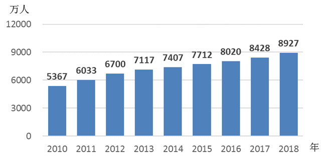 图4 2010—2018年普通本专科在校女生人数