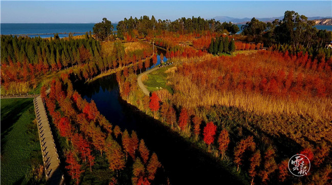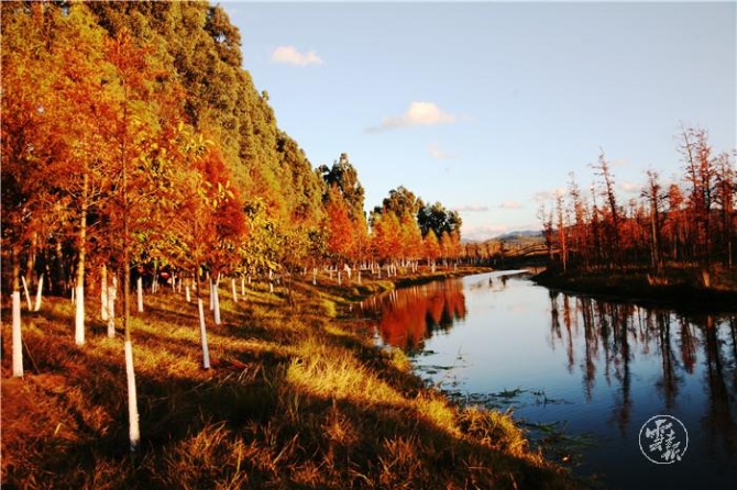 明代杨慎曾在《滇海曲》中夸赞昆明:苹香波暖泛云津,渔枻樵歌曲水滨。天气常如二三月,花枝不断四时春。每年11月末12月初,滇池边的中山杉就开始泛红,远远望去,大片的水上森林十分美丽。若天气晴好,在蓝天、白云、绿树、青草、枯黄的芦苇和各色鲜花的映衬下,色彩非常丰富而分明,让人赏心悦目。徜徉期间,呼吸着清新的空气,让人流连忘返。间或可以看到从西伯利亚远道而来的海鸥从上空飞过,湿地草丛中还能听到各种水鸟鸣叫声,为冬日增添了几分生动。