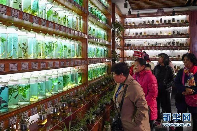 游客在石林杏林大观园中医文化展览馆参观了解各种中药原料