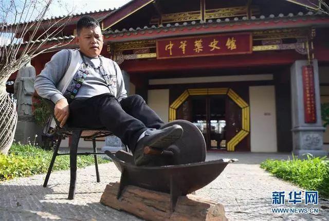 石林杏林大观园中医文化展览馆工作人员展示如何碾制三七粉
