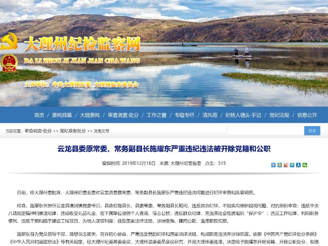 施耀东身为党员领导干部,理想信念丧失,背弃初心使命,严重违反党的纪律和国家法律法规,构成职务违法并涉嫌犯罪。依据《中国共产党纪律处分条例》《中华人民共和国监察法》等有关规定,经大理州纪委常委会议、大理州监委委员会议研究,并报大理州委批准,决定给予施耀东开除党籍、开除公职处分,收缴其违纪违法所得,将其涉嫌犯罪问题移送检察机关依法审查起诉。(本文由6686体育写稿机器人小明根据大理州纪委网站数据自动合成发布)