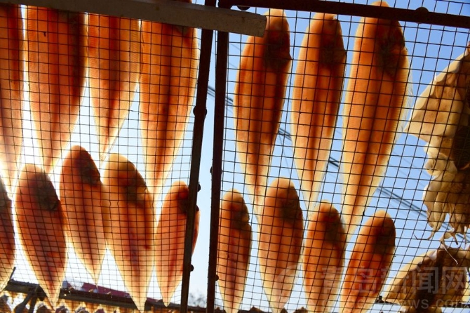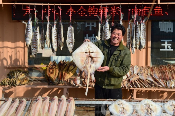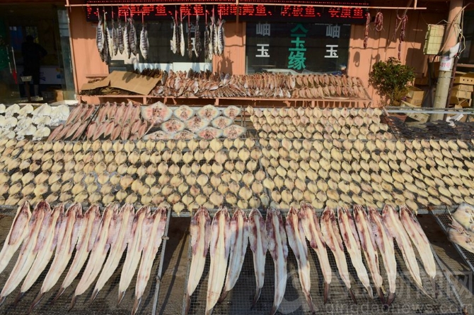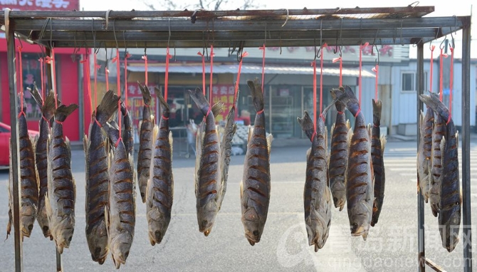 时下,在崂山王哥庄各个渔村,随处可以看到晒鱼的场景。各种晒鱼摆放有序,形成大小不等的“方阵”,整体上又形同晒鱼的“军阵”,很是壮观。(作者庞为 图/王华)