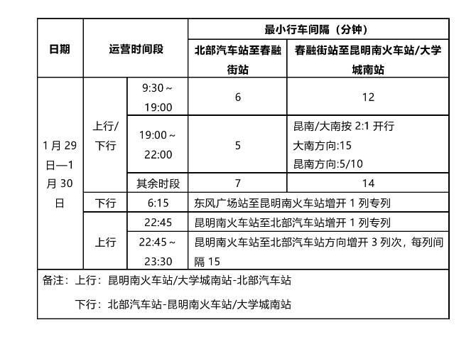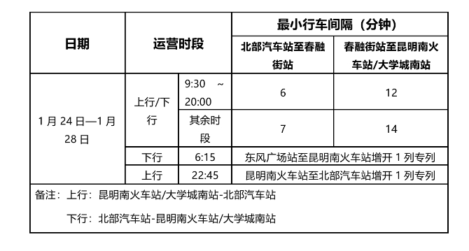 4.1月31日—2月9日期间,晚高峰延长至22:30,22点45分至23点30分加开3列次昆明南火车站至北部汽车站方向的列车。(云报客户端 记者龙舟)