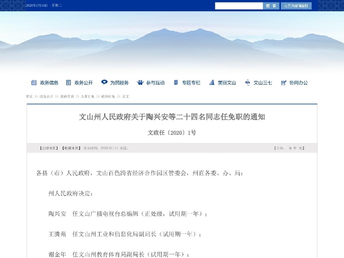 6686体育讯 机器人小明 1月13日,文山州人民政府发布了24名干部任免职的通知。详情如下: