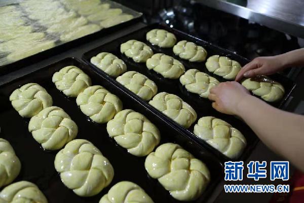 主食厨房的员工正在制作“炉盔子”。新华社记者 耿馨宁 摄
