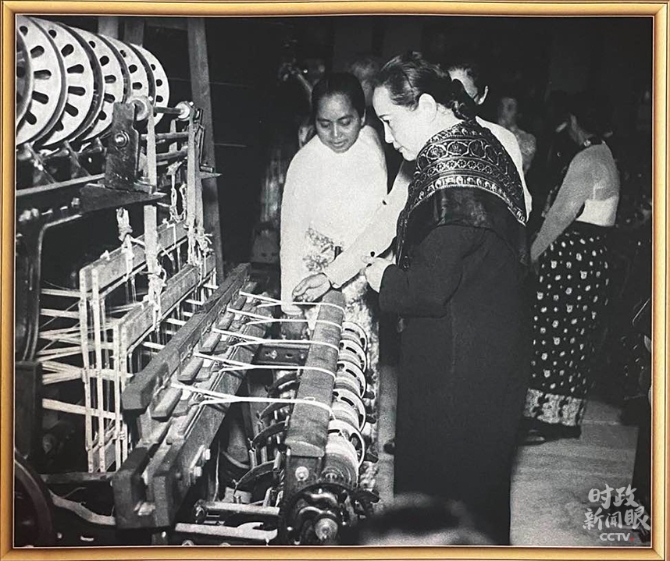 庆祝中缅建交70周年图片展展出了宋庆龄1956年访问缅甸参观纺织研究所的照片,陪同她的白衣女士就是昂山素季的母亲都庆枝。那一年,昂山素季约11岁。