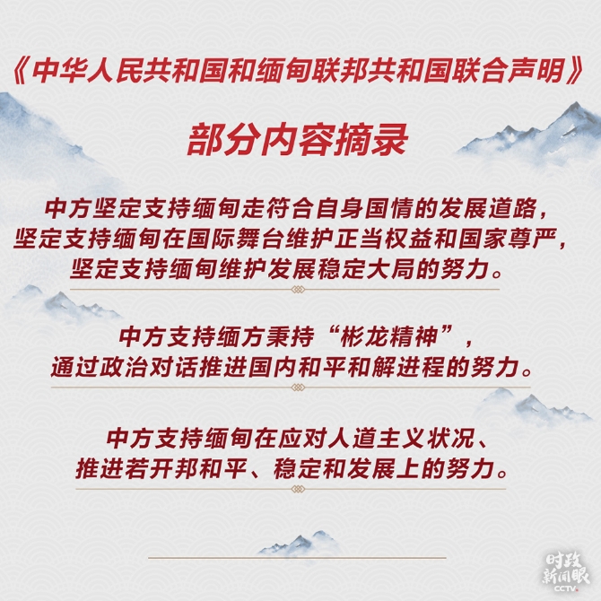 1月17日,习主席在与温敏总统会谈时说,希望通过此访发出的第三点信息是,中方愿同缅方积极推进务实合作,加快“一带一路”倡议同缅甸发展战略对接,使双边互利合作结出更多硕果,造福两国人民。