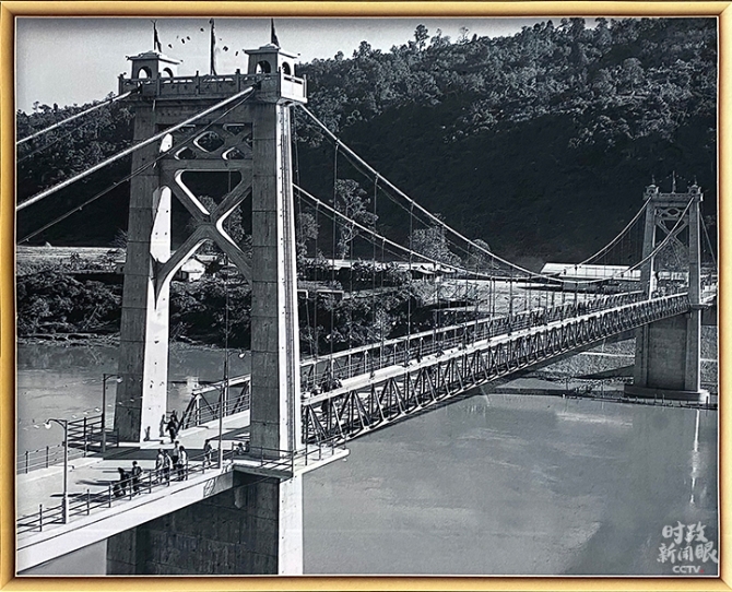 △ 1965年12月22日,中国援建缅甸的滚弄钢索吊桥建成通行,成为两国“友谊桥”。