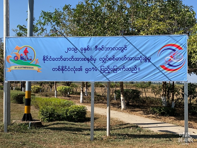 △《时政新闻眼》在内比都大街上看到这样一条缅甸语横幅,翻译成中文是“热烈庆祝2019年缅甸全国通电率实现50%”。(总台央视记者马超拍摄)