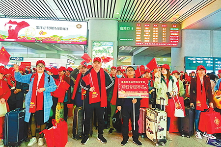 戴着小红帽,围着红围巾,手上还拎着大包小包的行李、年货。1月13日,由滇粤两地人社部门携手开展的“滇粤劳务协作回乡专列”活动首趟列车D3830次从广州南站抵达昆明南站,14名新平籍务工人员乘“回乡专列”回到家乡。
