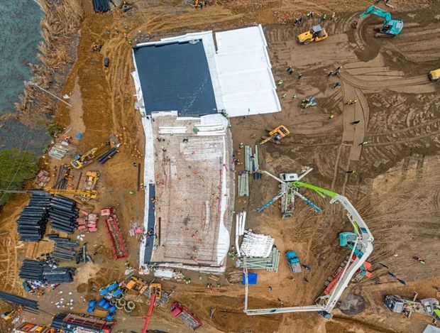 施工企业全部完成项目场地整平、碎石黄沙回填,管沟开挖持续进行。HDPE膜面积达3万平方米,铺贴面积已经过半,北区板房基础混凝土浇筑完成。