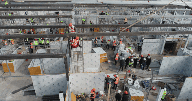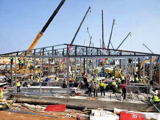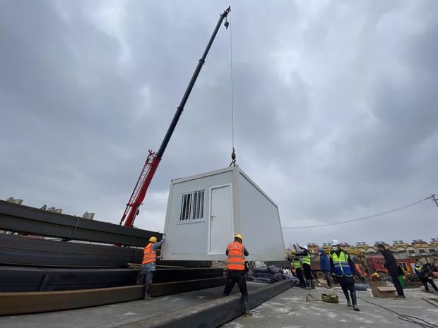 下午16时,中建三局等全部完成现场场地平整和回填,板房基础混凝土浇筑完成约90%,完成300多个箱式板房骨架安装,同时场外抓紧板房拼装,完成约400个,吊至现场直接安装。水电暖通、机电设备等材料全面到位,同步开始作业。