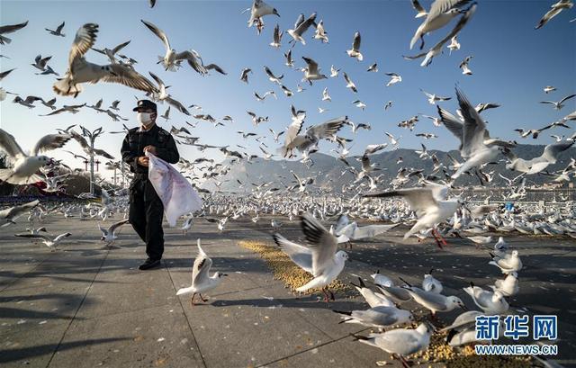 2月2日,昆明市滇池国家旅游度假区草海大坝综合管理办公室的工作人员在投放鸥粮。新型冠状病毒感染的肺炎疫情防控工作启动以来,昆明市关闭了多个景区,其中包括翠湖公园、草海大坝等观鸥景点。为了保证红嘴鸥顺利过冬,昆明市林业和草原局等部门1月26日起组织工作人员每天两次在红嘴鸥主要的觅食点进行投喂,每天投喂的鸥粮有1000多公斤。新华社记者 江文耀 摄