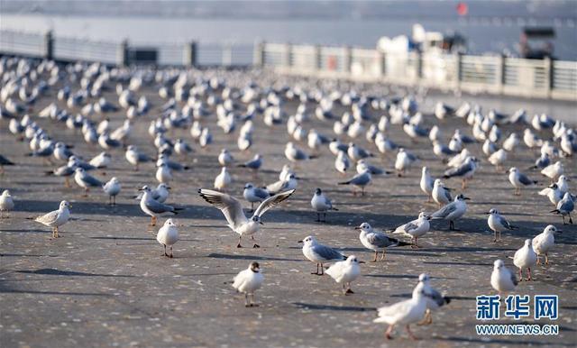 红嘴鸥在昆明草海大坝上等着“吃早饭”。新华社记者 江文耀 摄