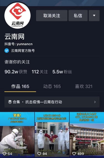 其中,云报客户端推出的H5作品《共同战“疫”我承诺》和小程序“战‘疫’集结号 头像传递正能量”累计传播量近400万,H5作品《我是共产党员 我承诺》传播量过百万。各地各网站纷纷推出“@乡亲们 防控疫情大喇叭开始广播啦!”等新媒体产品,通过云南方言以接地气的表达,呼吁网民自觉增强防护意识和能力,在抖音等平台迅速走红。云视网顺应网民好奇心,采编刊发《“干皮潦草、跳脚麻手…”火爆全网的云南硬核“老村长”我们帮您找到了》一文,进一步推高系列“土味”宣传的热度,相关短视频观看量超过2亿。