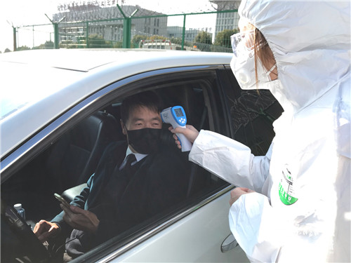 工作人员为司机师傅测量体温