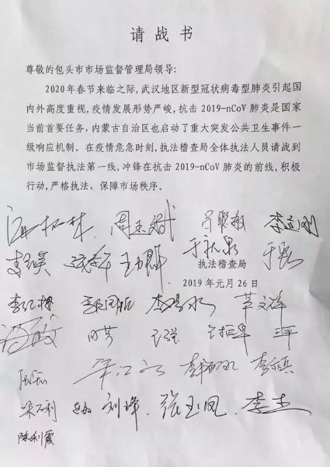 一封请战书,字不多,却在空白处满满签下28个人的名字,字迹慷慨!洒脱!!激昂!!!整整一页纸装满的不是幅面,而是初心、使命、责任、担当……为贯彻落实党中央、国务院和自治区党委政府、包头市委市政府《关于新型冠状病毒感染的肺炎防控工作》的决策部署,现将疫情防控作为重大政治任务,坚决做好疫情防控工作。作为包头市场监管人,主动放弃春节假期与家人团聚的机会,坚守岗位、履职尽责,自除夕当天,就坚定迈步走在了对食品、药品、餐饮、医疗机构、医疗器械企业,生产和流通企业以及集贸市场、大中型超市、酒店等市场经营主体的巡查检查道路上,踏石留印,抓铁有痕,只为一个共同心愿——抗击新型冠状病毒感染的肺炎疫情,共度时艰!